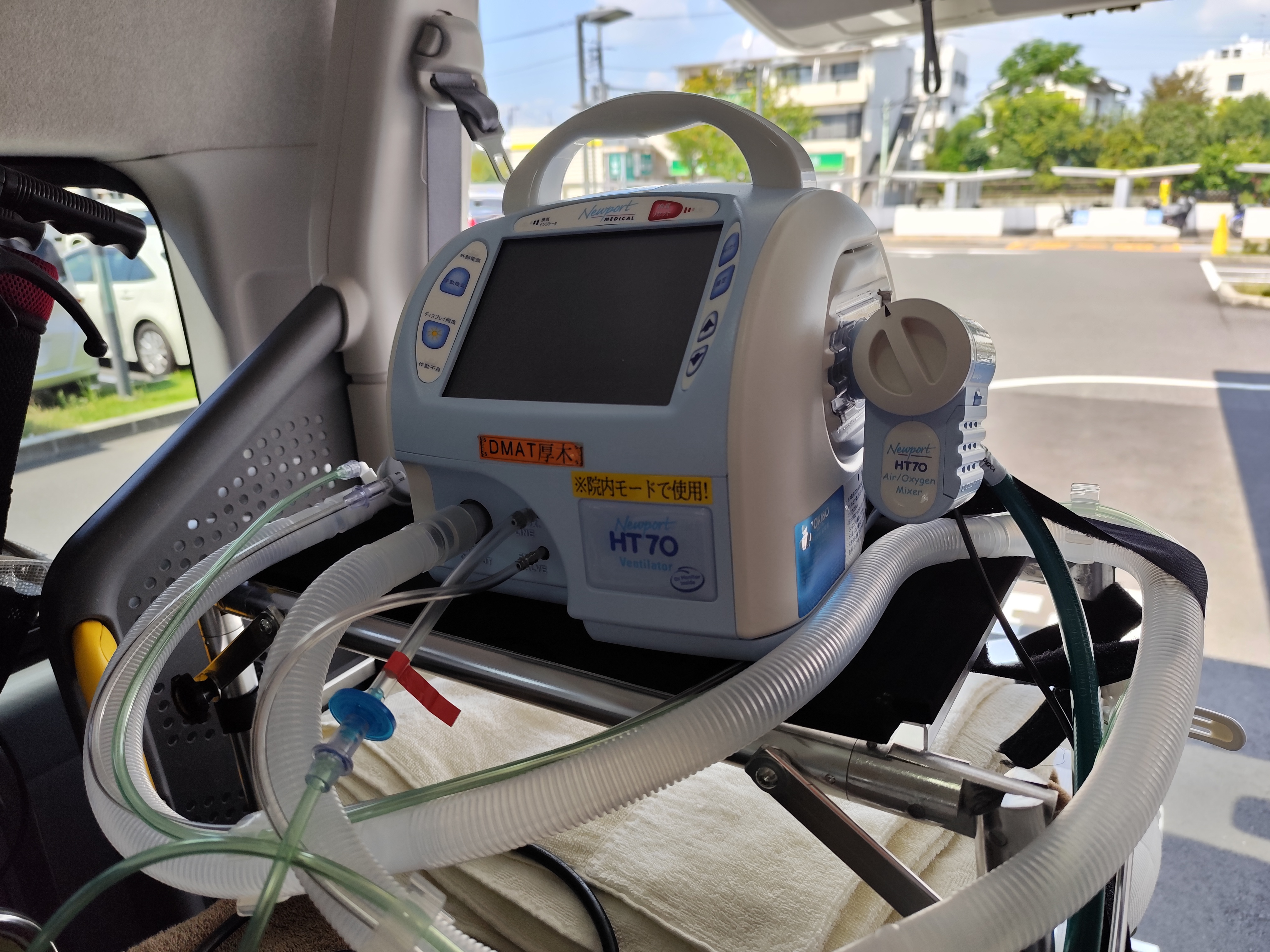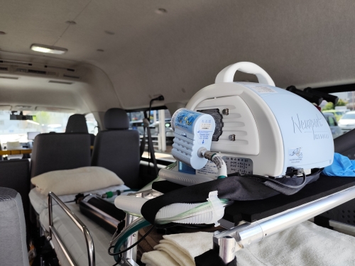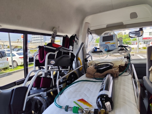 看護師同乗のもと、呼吸器管理、輸液管理、バイタルチェック、適宜吸引を行いながらの搬送でした。